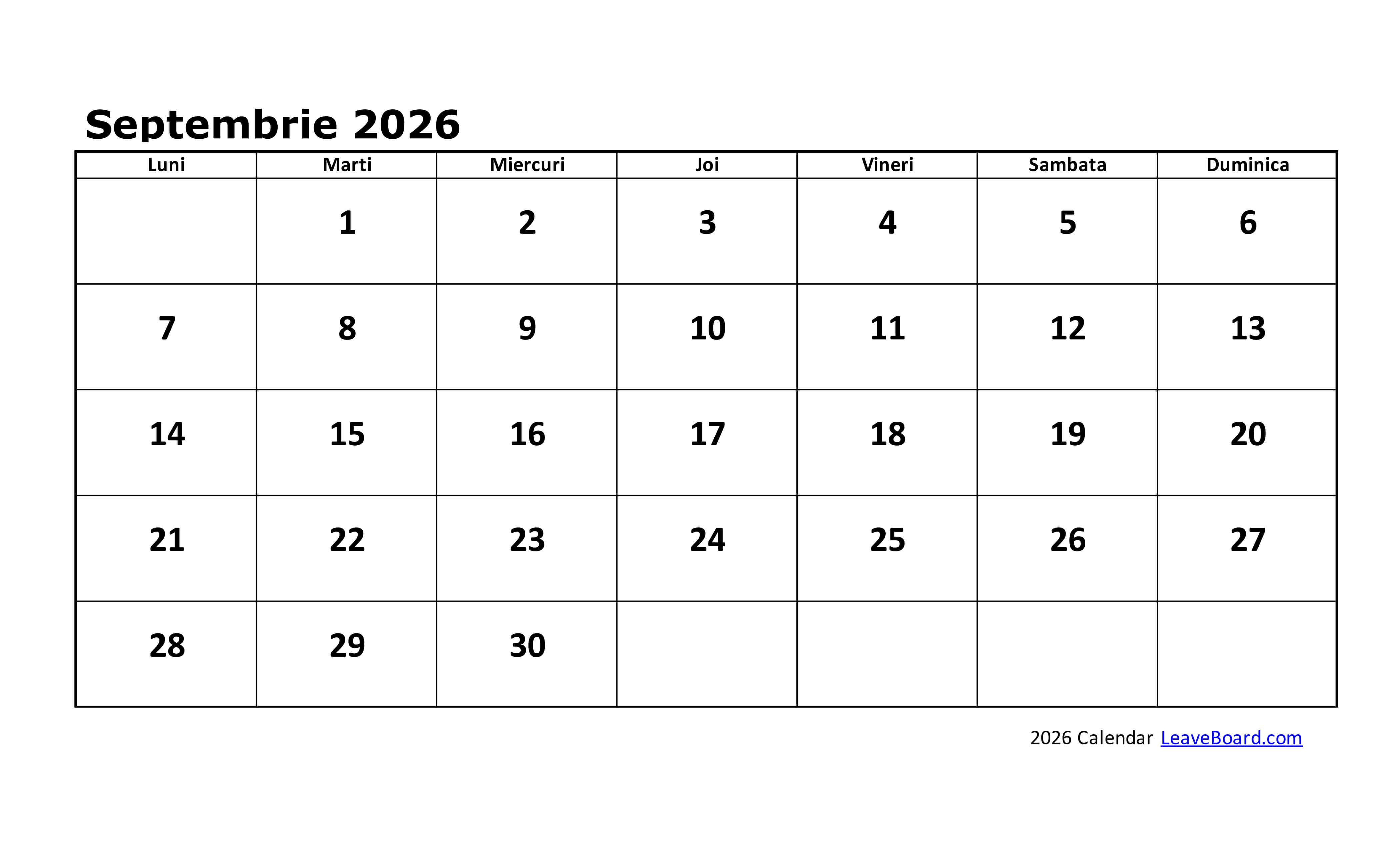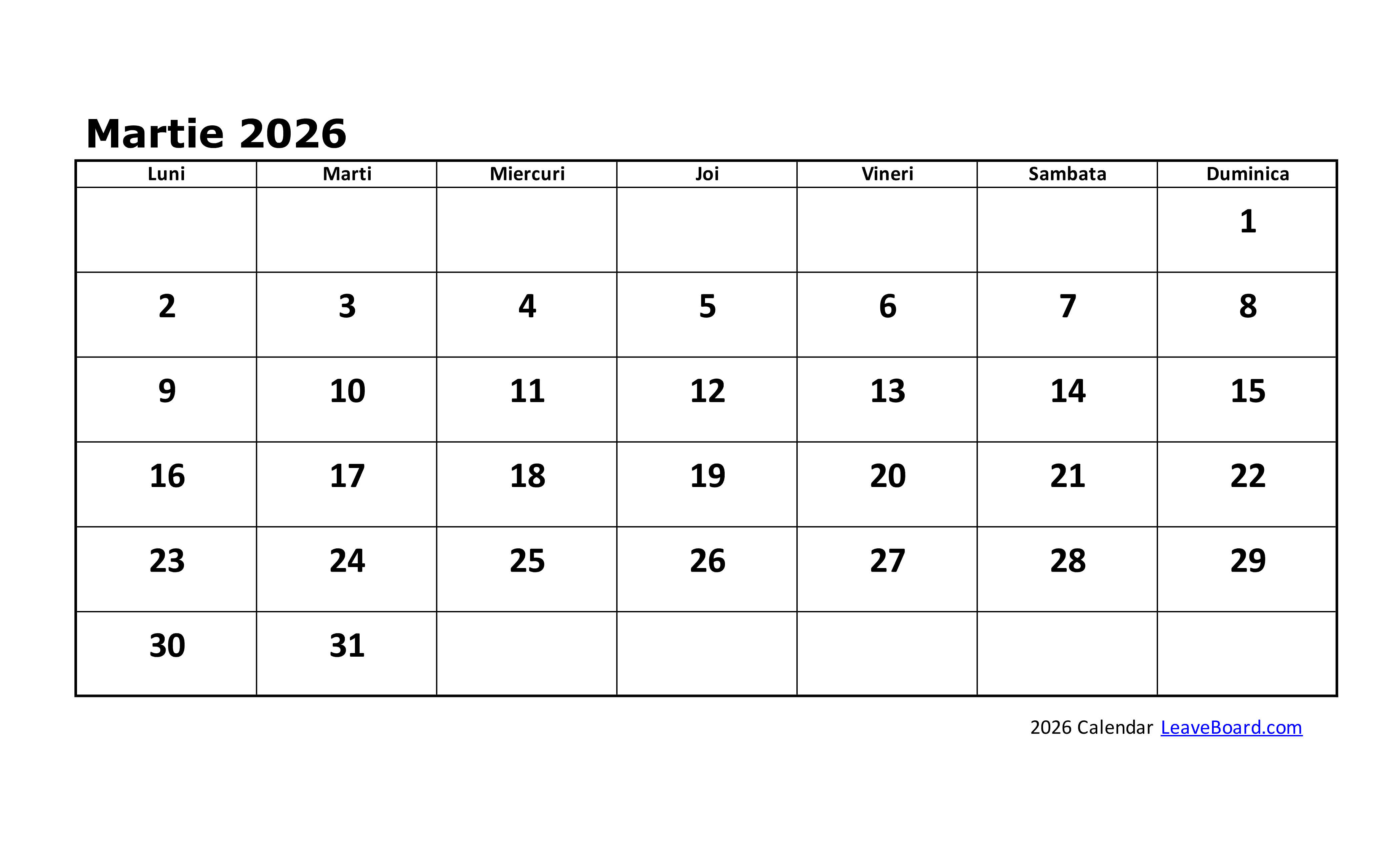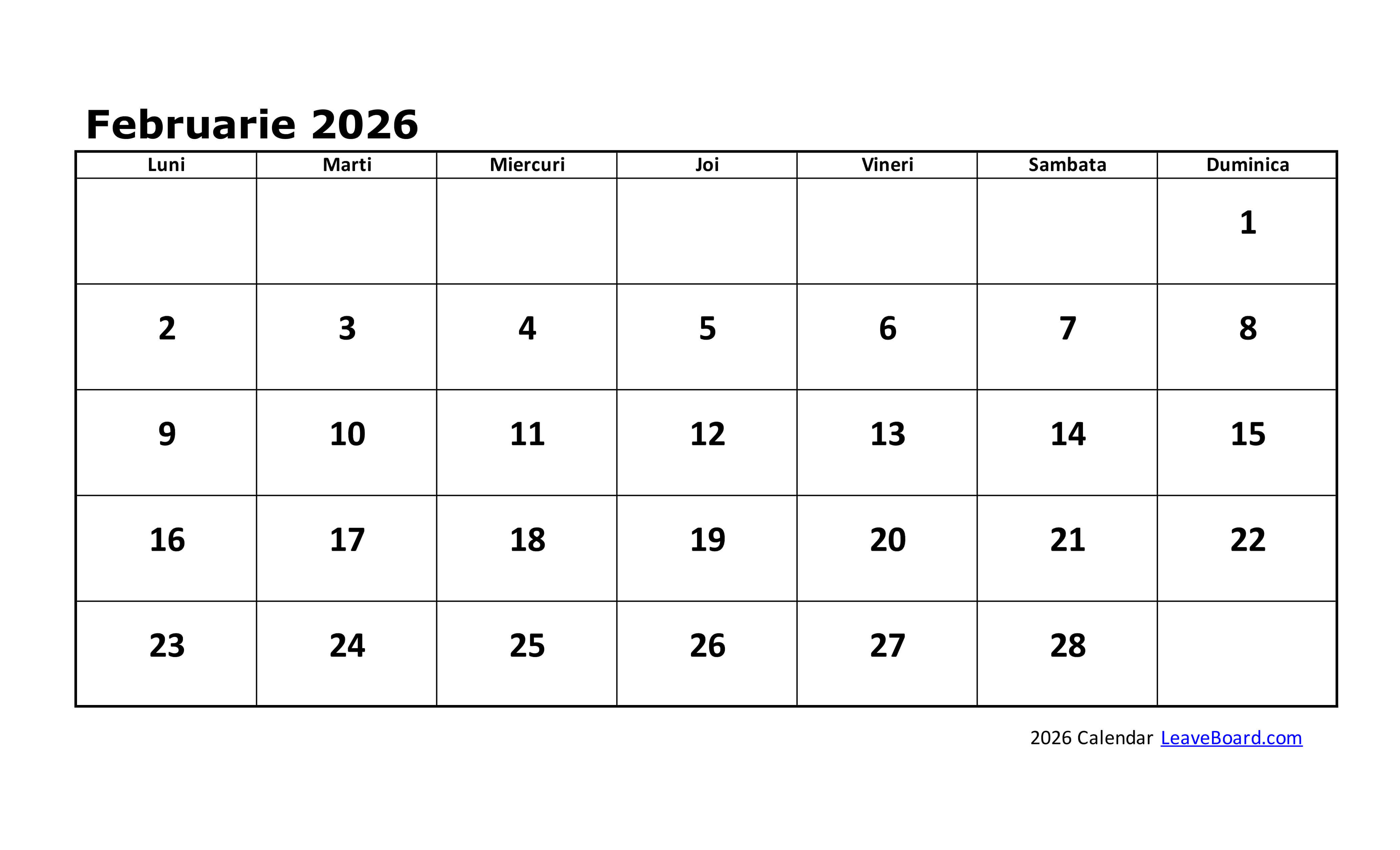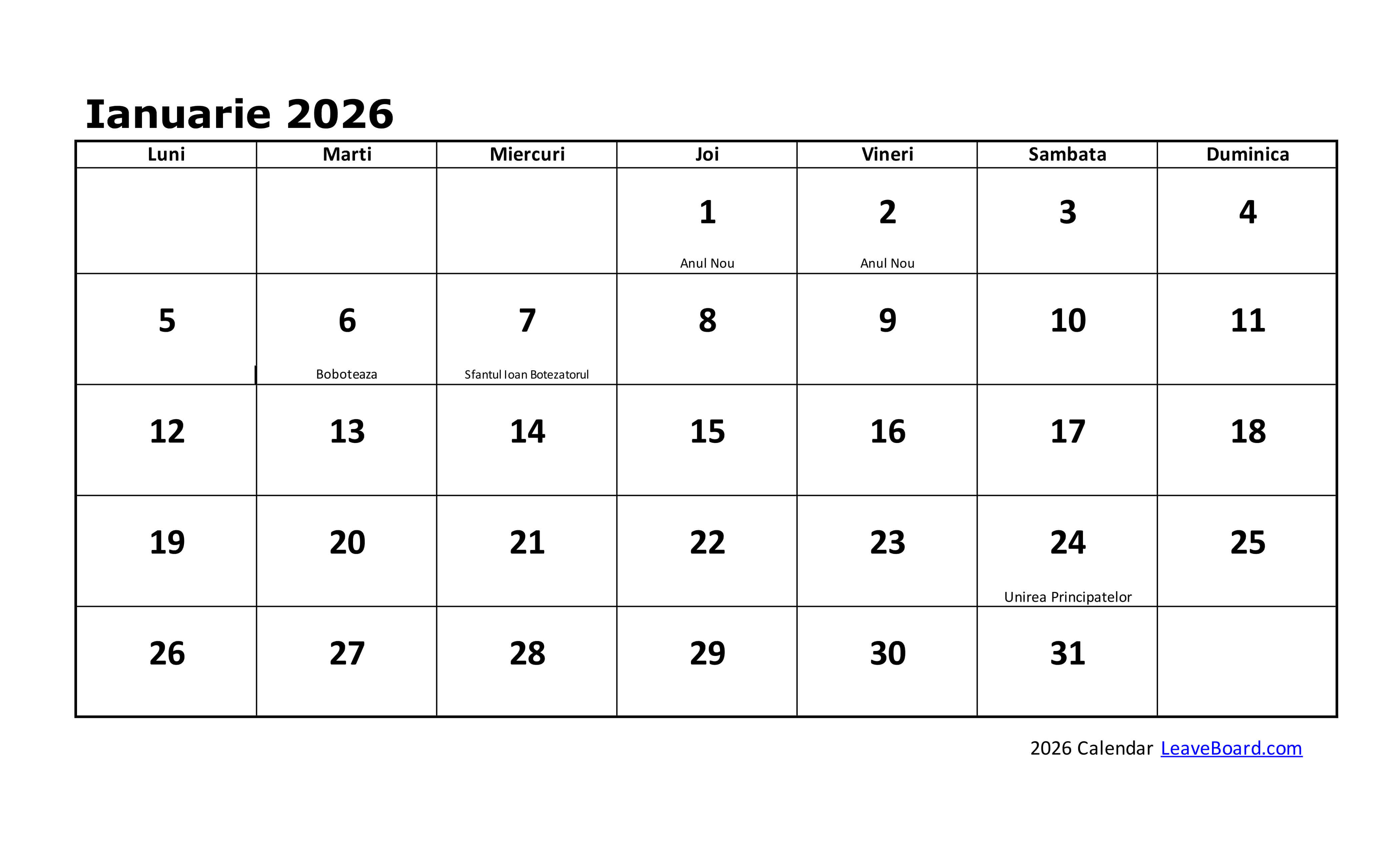 Calendarul 2026 poate fi particularizat sau tipărit simplu, cu o pagină pentru fiecare lună în parte.