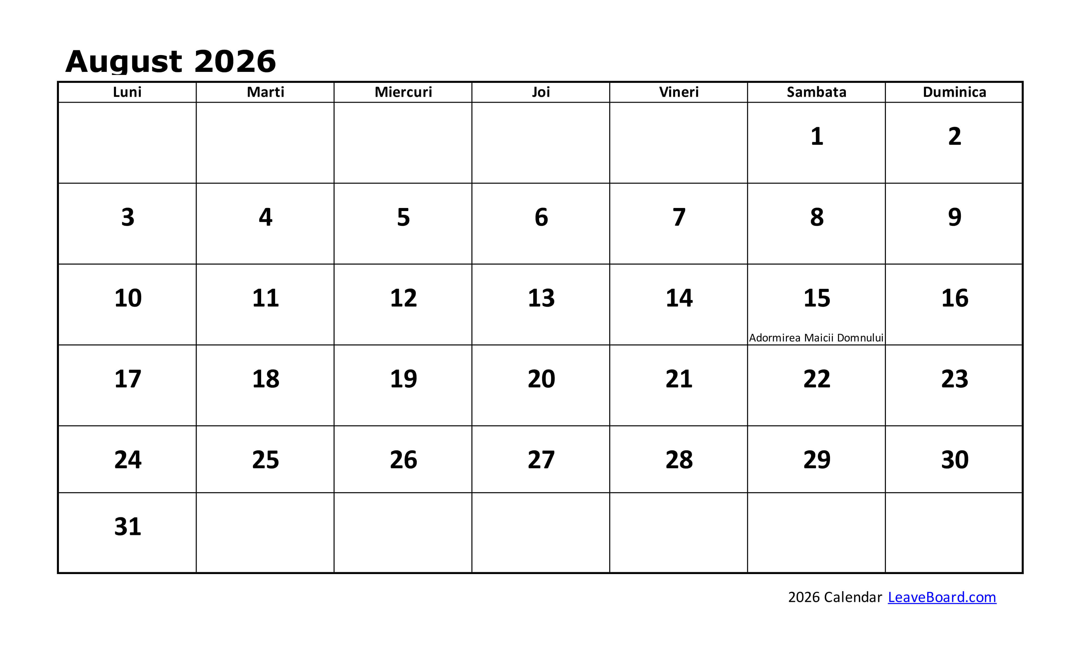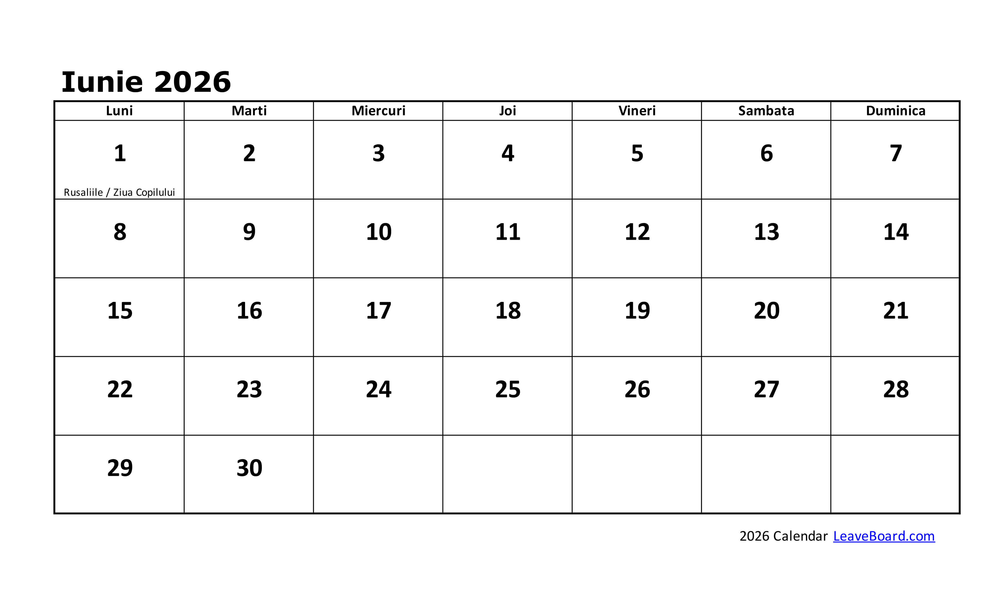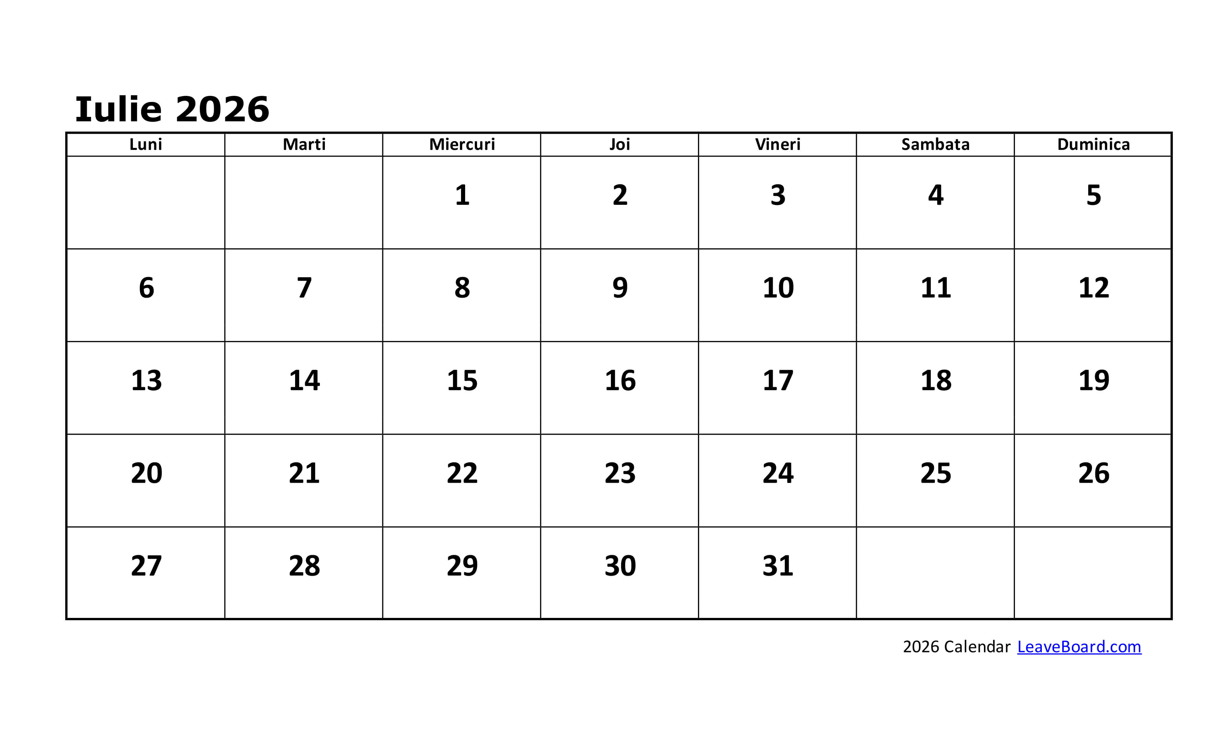 Calendarul 2026 poate fi particularizat sau tipărit simplu, cu o pagină pentru fiecare lună în parte.