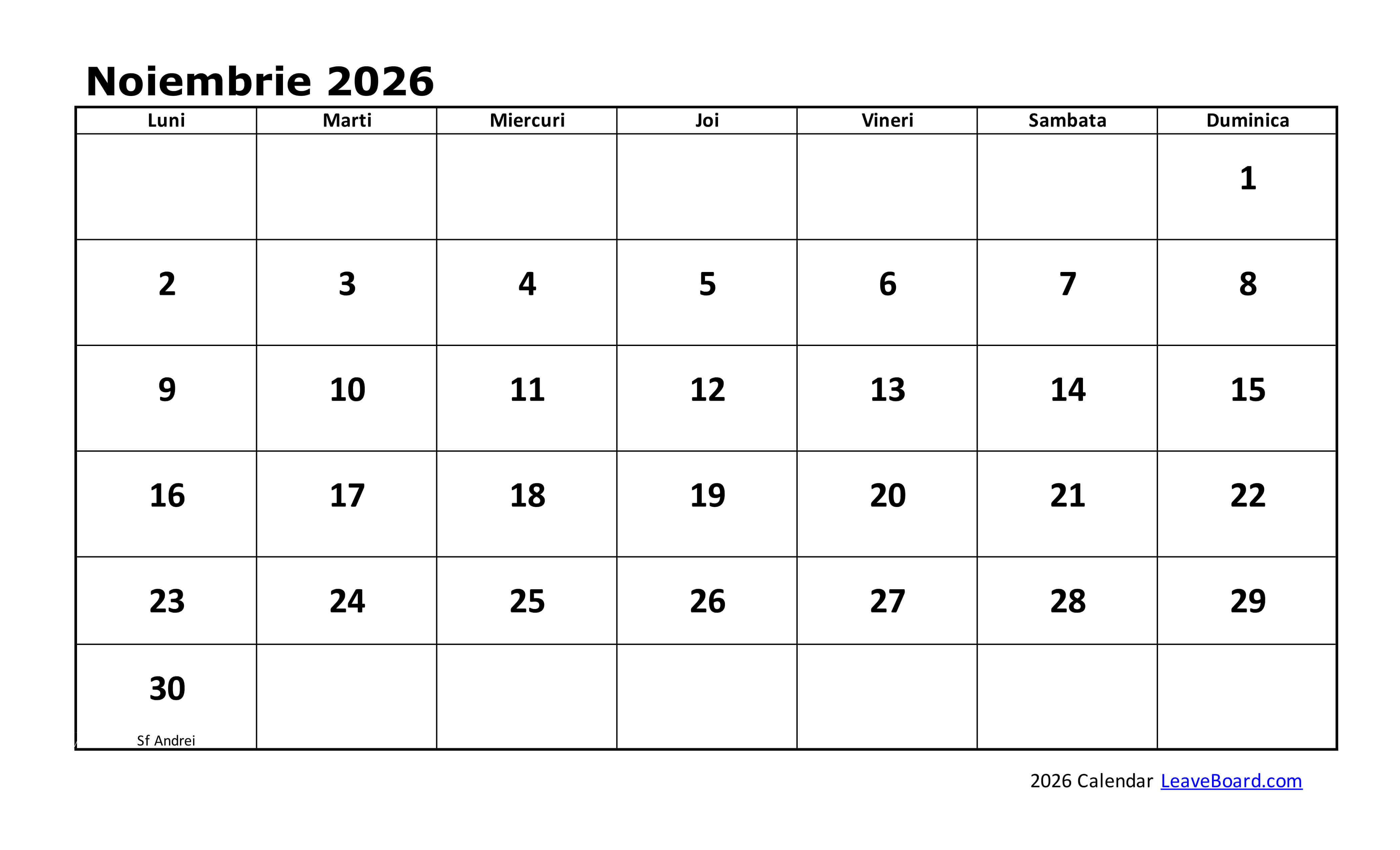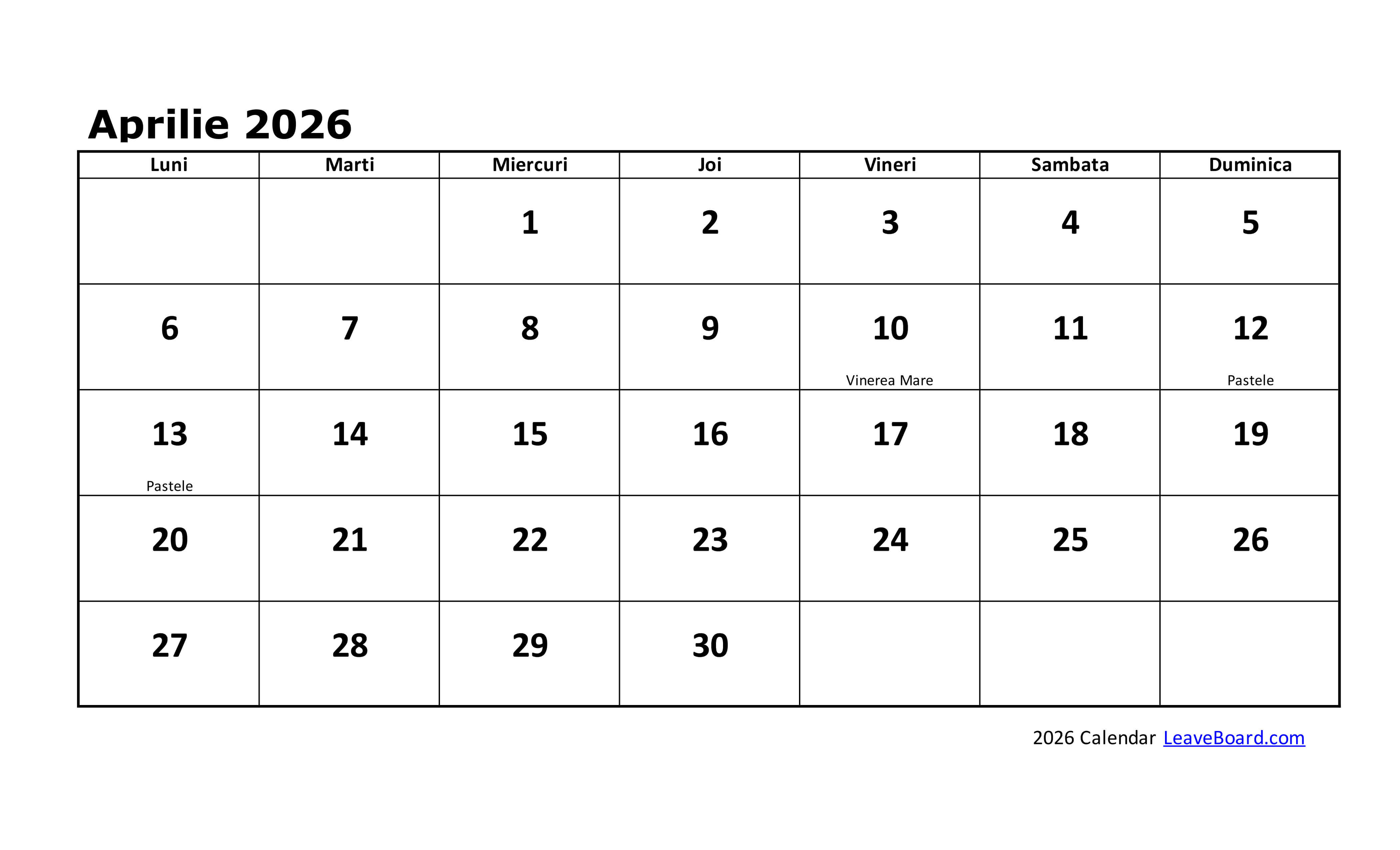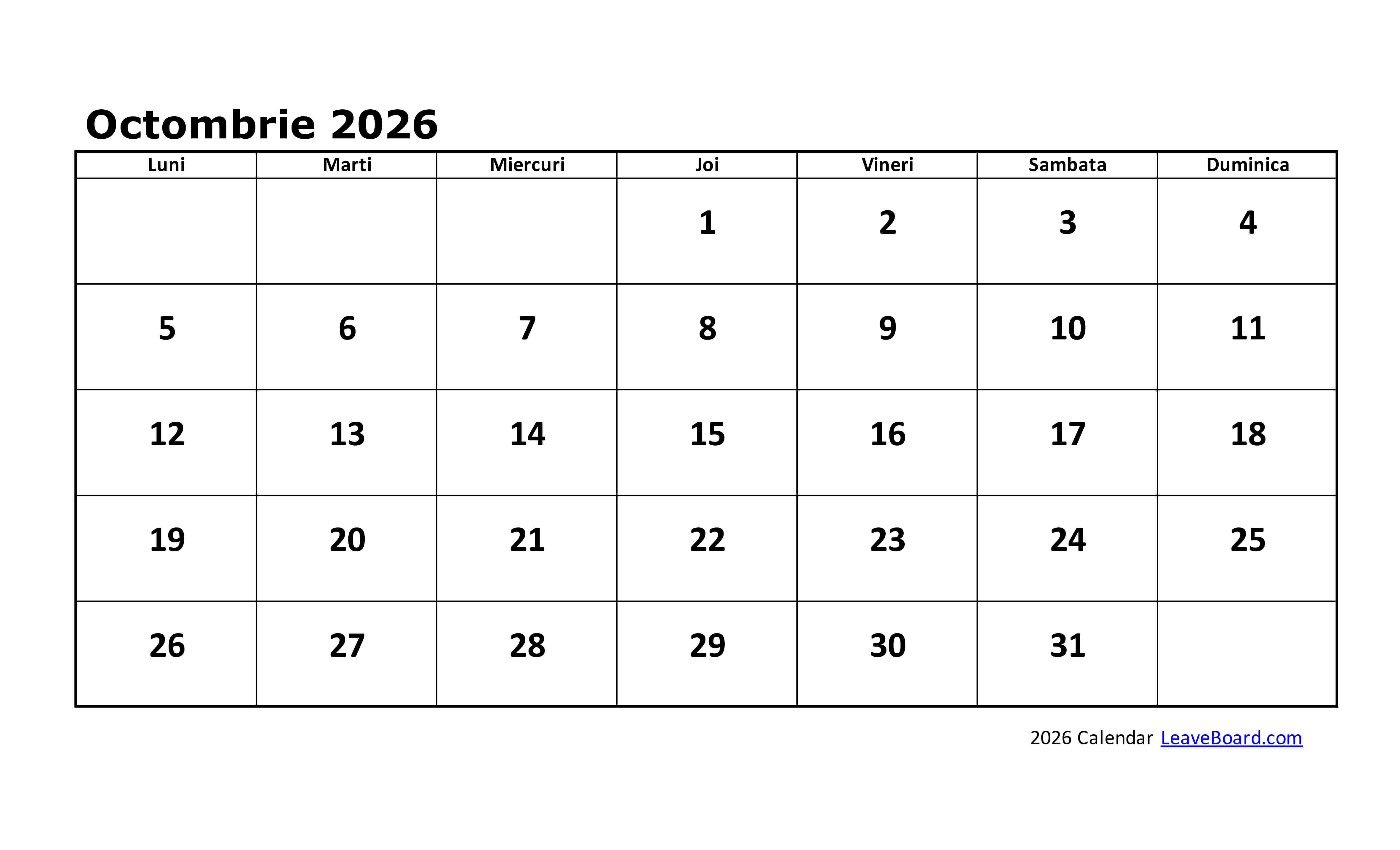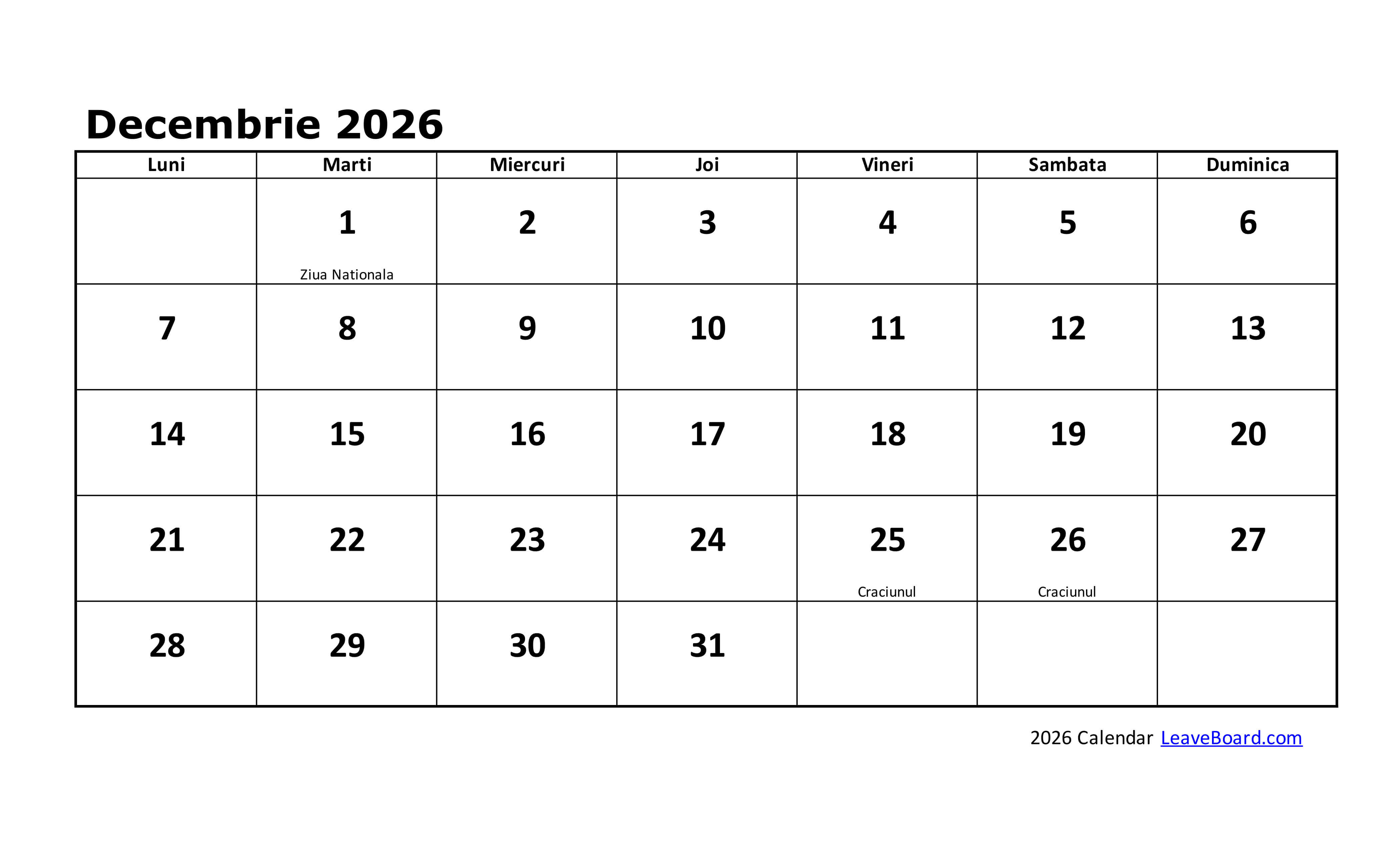 Calendarul 2026 poate fi particularizat sau tipărit simplu, cu o pagină pentru fiecare lună în parte.