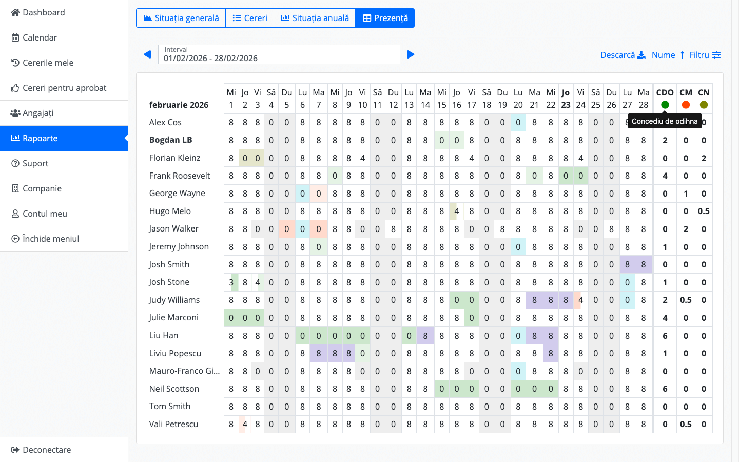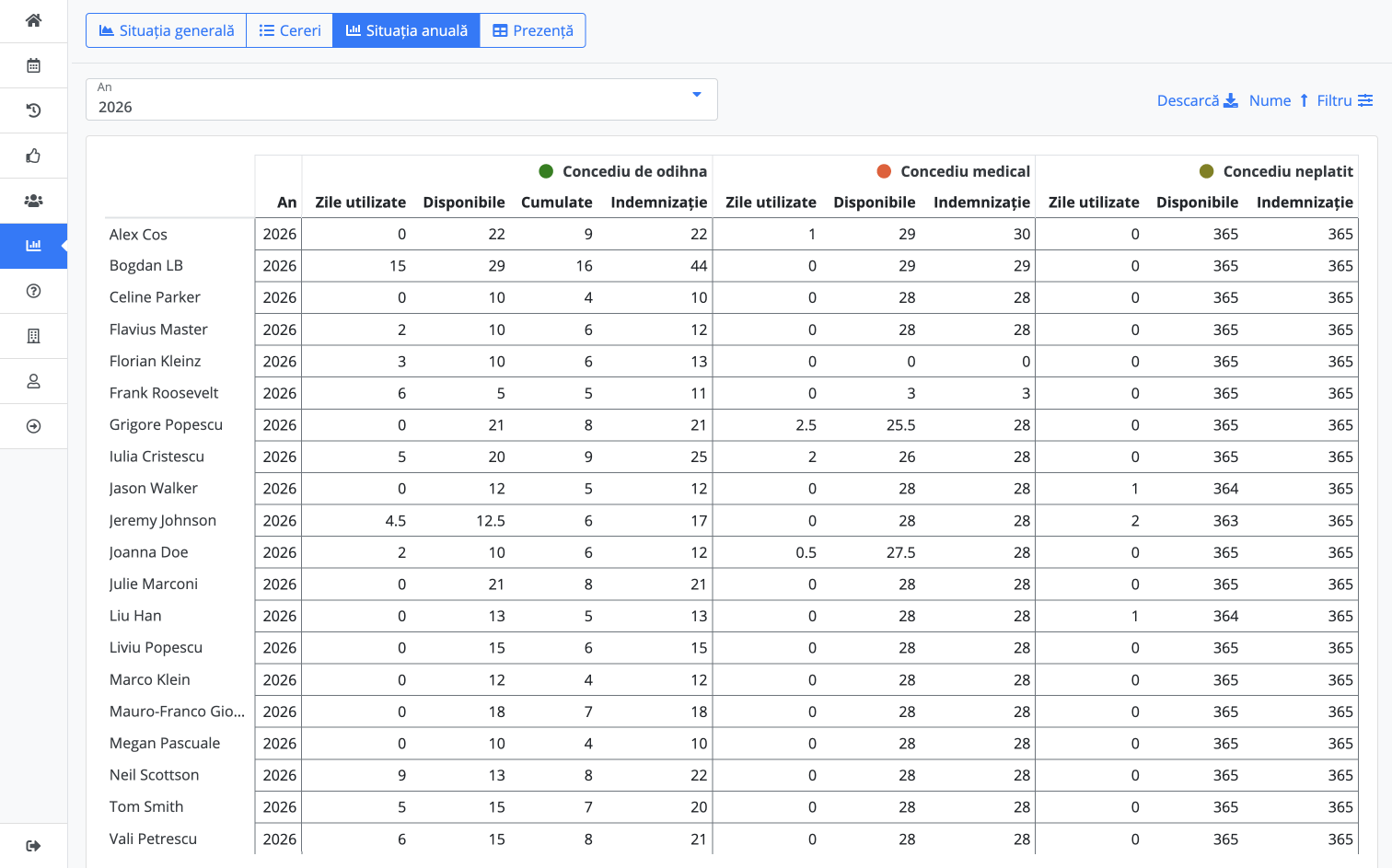 Rezultatele concediilor pot fi descărcate în format .XLSX și .CSV pentru a ajuta cu salarizarea lunară și alte activități de resurse umane din cadrul companiei dvs. Salutați viitorul HR și uitați de sheeturile Excel vechi și dezordonate. Dacă căutați un raport PDF, atunci din Excel > Salvați fișierul ca PDF.