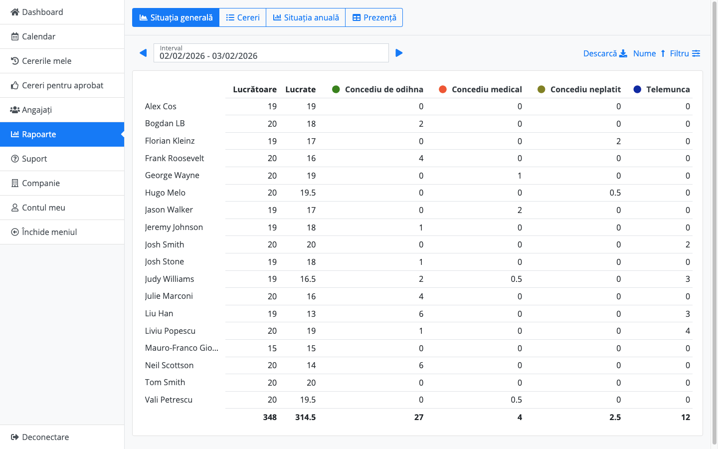 Notă: Dacă descărcați pontajul în format Excel, click pe , veți avea un fișier în care pentru fiecare angajat veți avea marcate concediile, zilele lucrătoare, zilele libere, sărbătorile legale, numărul de ore lucrate lunar, pentru fiecare angajat inclusiv pentru noii recruți dar și cei care au decis să părăsească firma.
