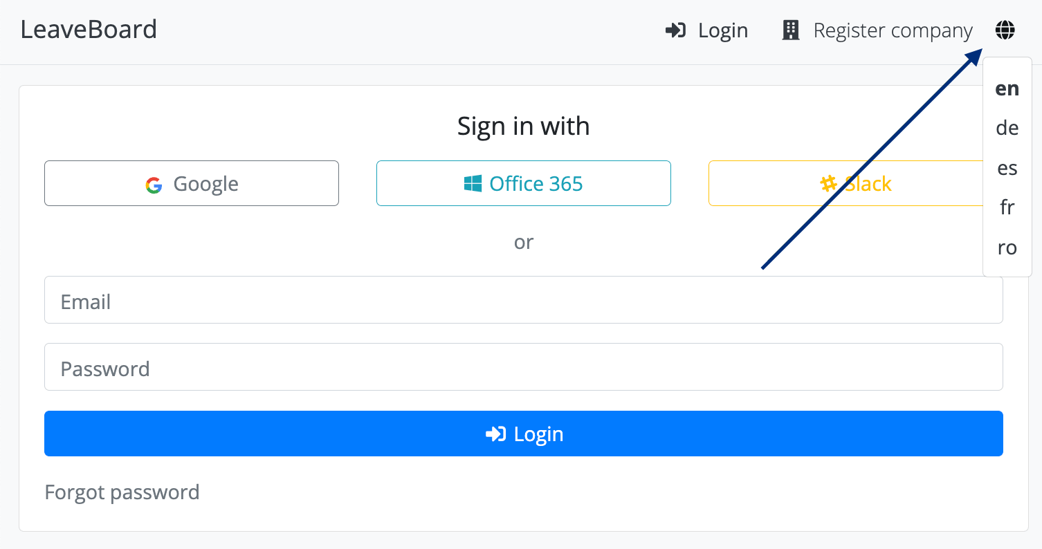 To change the language of the interface from English to French, German, Spanish or Romanian, when you login, on the top-right corner globe icon, click on it and select the language you desire within the HR web-app.